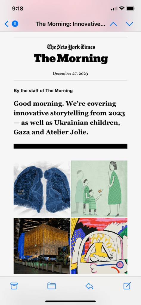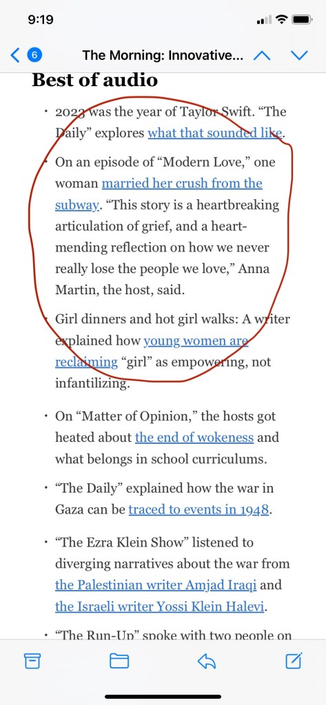 Every morning I read my NY Times Morning Newsletter, bracing for the horror the news so often delivers but appreciating the writing’s concise and conversational tone, not to mention the pop culture shoutouts and occasional bomb recipe. Imagine my surprise when I clicked to discover my Modern Love podcast today, chosen as “Best of Audio 2023”? I almost spit out my coffee.
